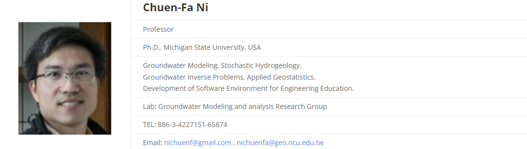 Chuen-Fa Ni ProfessorResearch Interests Groundwater Modeling, Stochastic Hydrogeology, Groundwater Inverse Problems, Applied Geostatistics, Development of Software Environment for Engineering Education